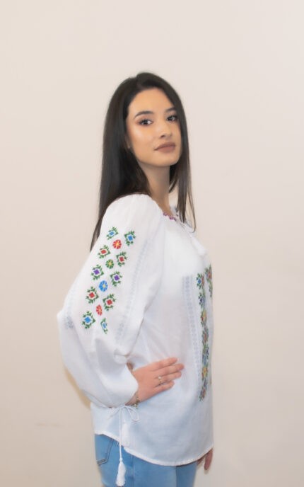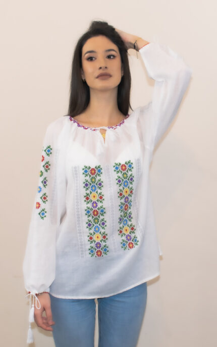 Ie cu motive tradiționale, brodată la mașină.