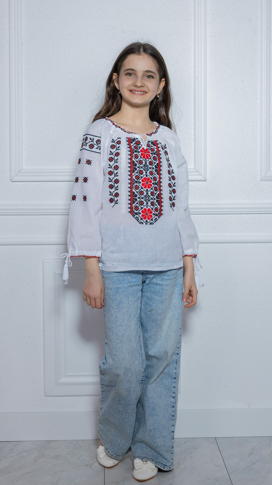 Ia „Cipriana” este o piesă de inspirație tradițională care aduce în prim-plan frumusețea liniilor simetrice și puterea simbolurilor cusute cu grijă. Broderia florală roșu-negru, dispusă pe piept, mâneci și tiv, evocă o eleganță clasică, potrivită pentru fetițele care poartă cu mândrie tradiția.