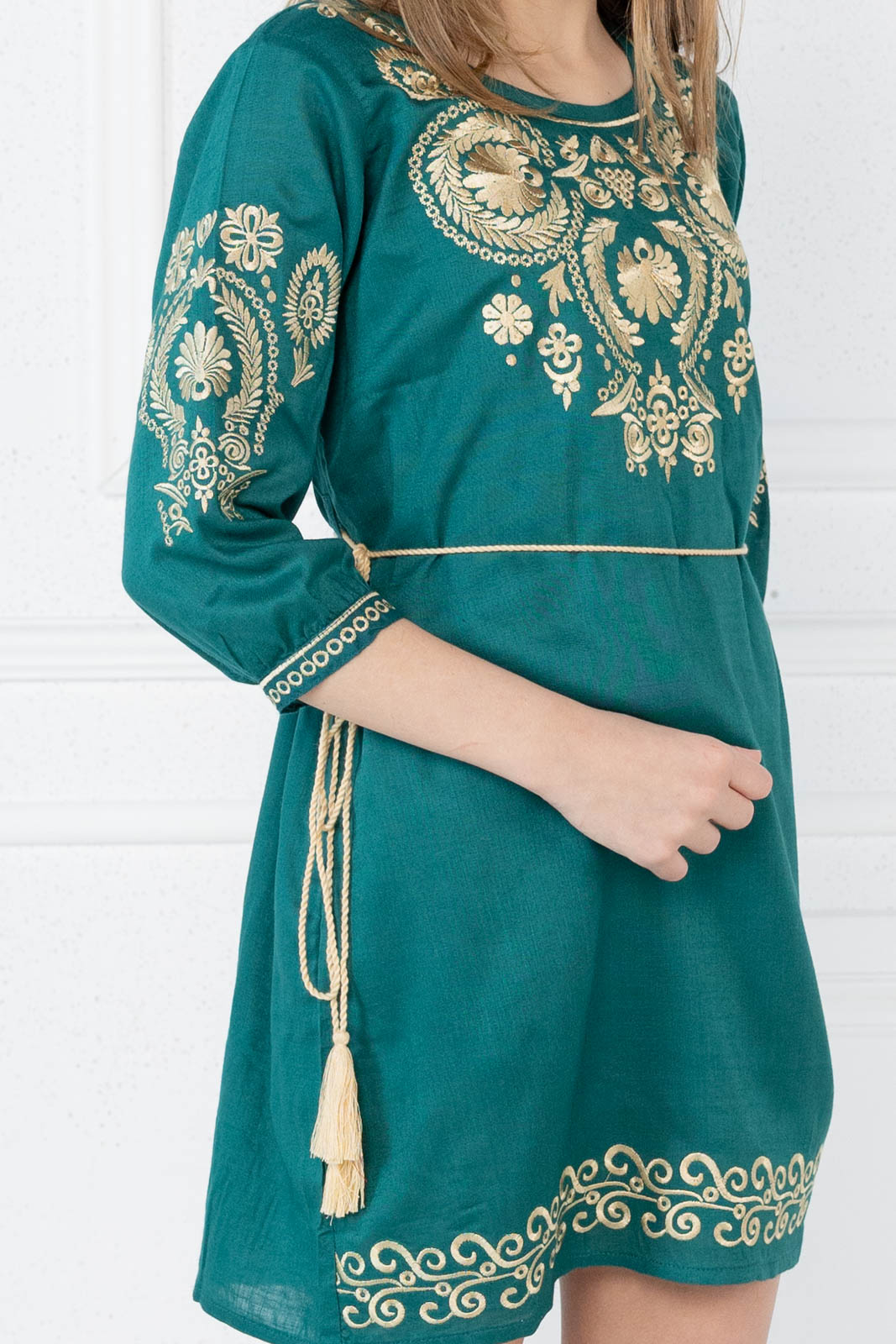 Această rochie verde pentru fetițe, decorată cu broderie aurie delicată, este alegerea ideală pentru momente deosebite. Cu un design rafinat și un contrast elegant între materialul intens colorat și broderia sofisticată, rochia aduce un plus de grație și eleganță. Motivele florale și geometrice brodate conferă un aer tradițional reinterpretat modern. Croiala lejeră, cu mâneci trei sferturi și talie ușor accentuată, oferă libertate de mișcare și confort. O piesă vestimentară de poveste, perfectă pentru evenimente speciale, serbări sau zile în care micile prințese vor să strălucească.