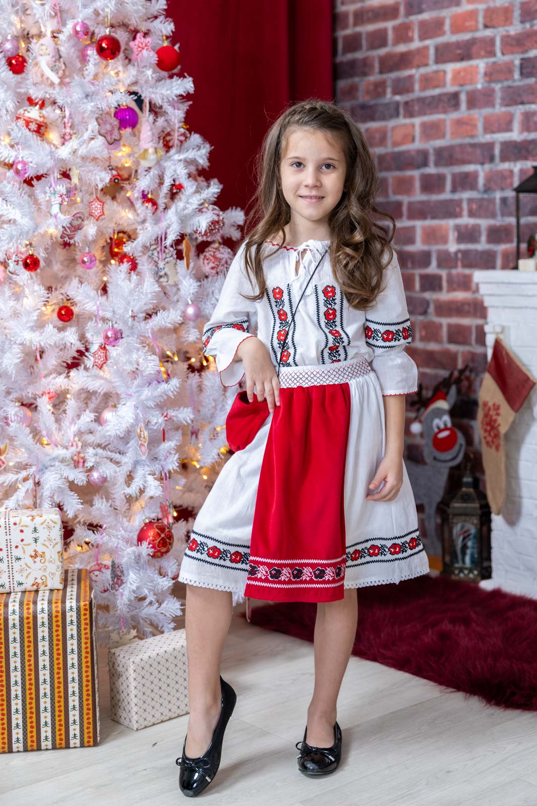 Setul Tradițional Maia pentru fete conține vestă, fustă, 2 fote, ie și geantă, cu motive românești. Ținută completă, elegantă și perfectă pentru serbări, festivaluri și sărbători.