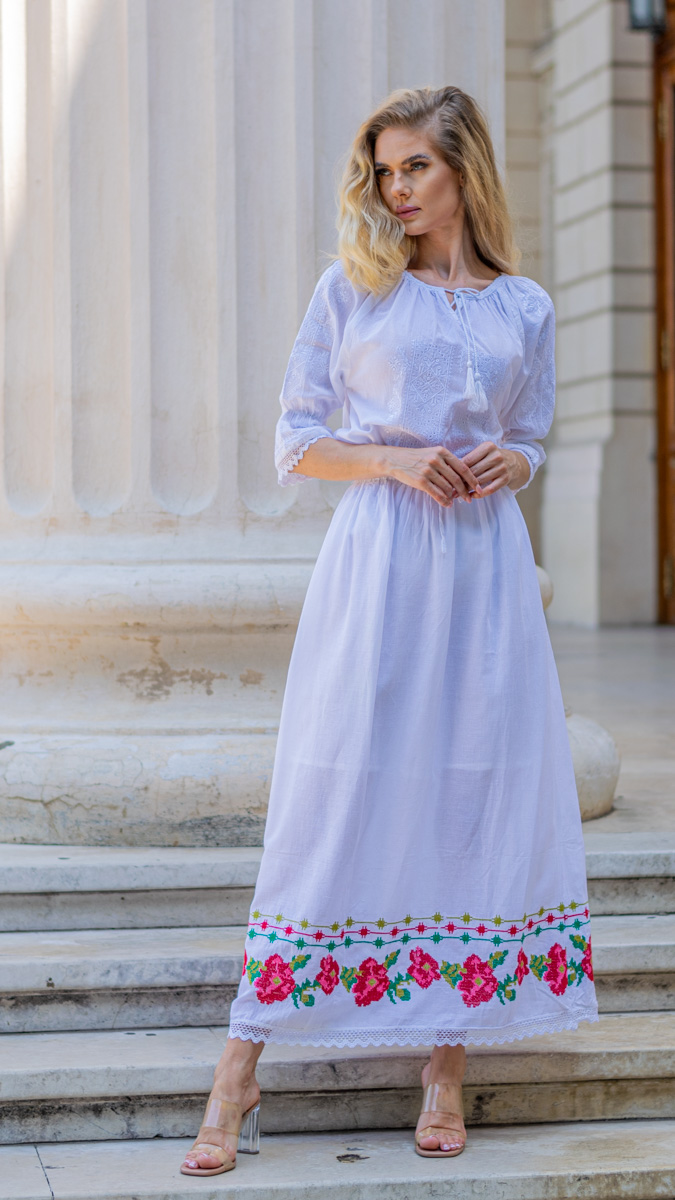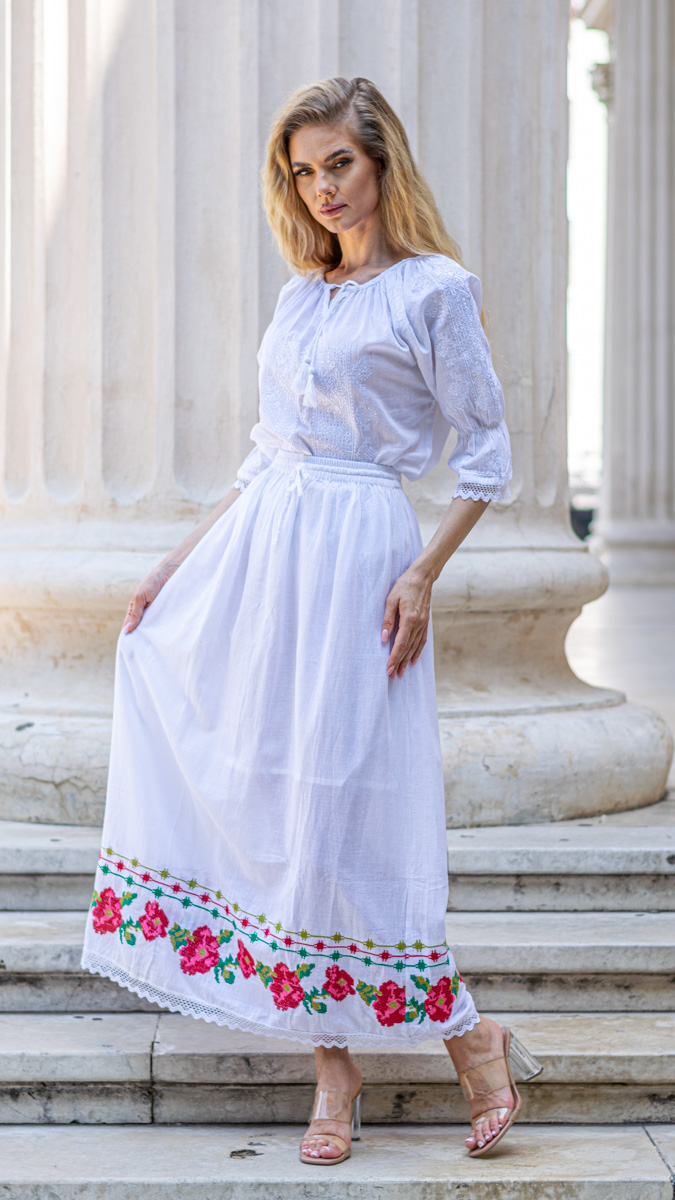 Această fustă albă pentru damă, decorată cu broderie în motive florale, atrage privirile prin eleganța sa tradițională și detaliile vibrante. Cusăturile florale roșii adaugă un contrast spectaculos pe fundalul alb, creând un look feminin și rafinat. Ideală pentru evenimente speciale sau pentru a aduce un plus de autenticitate în ținutele casual, această fustă combină armonios tradiția cu un stil modern și atrăgător.