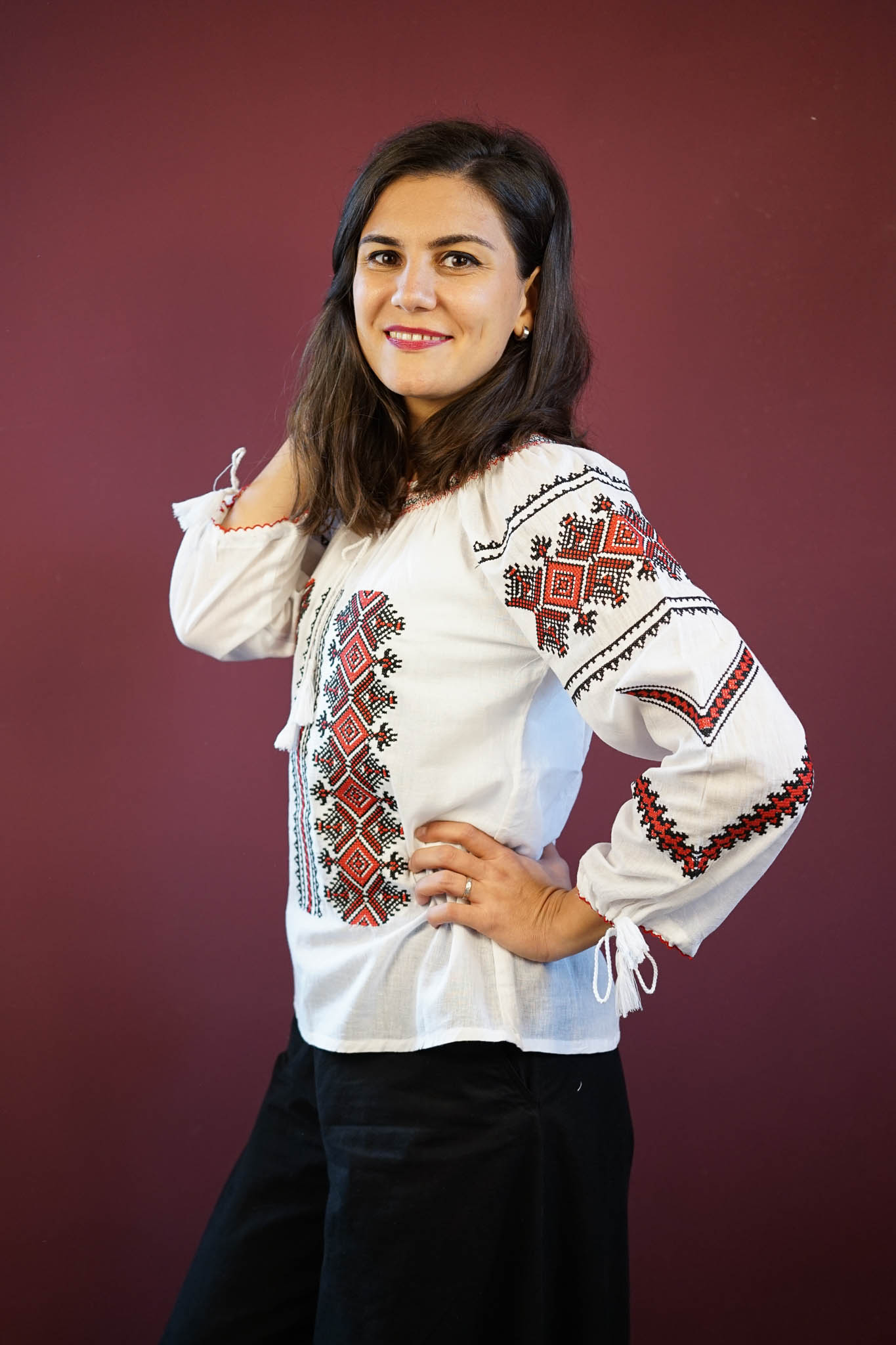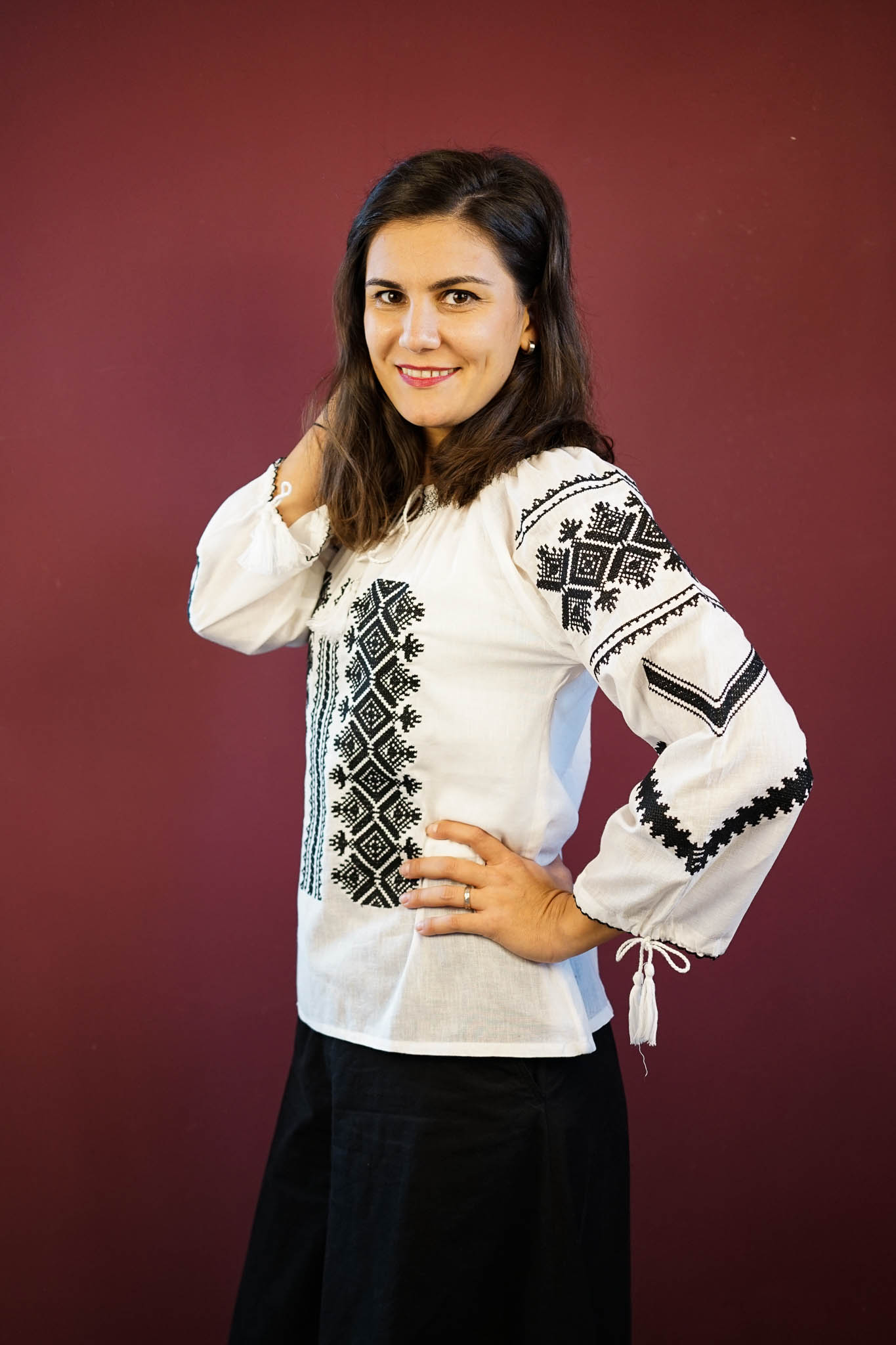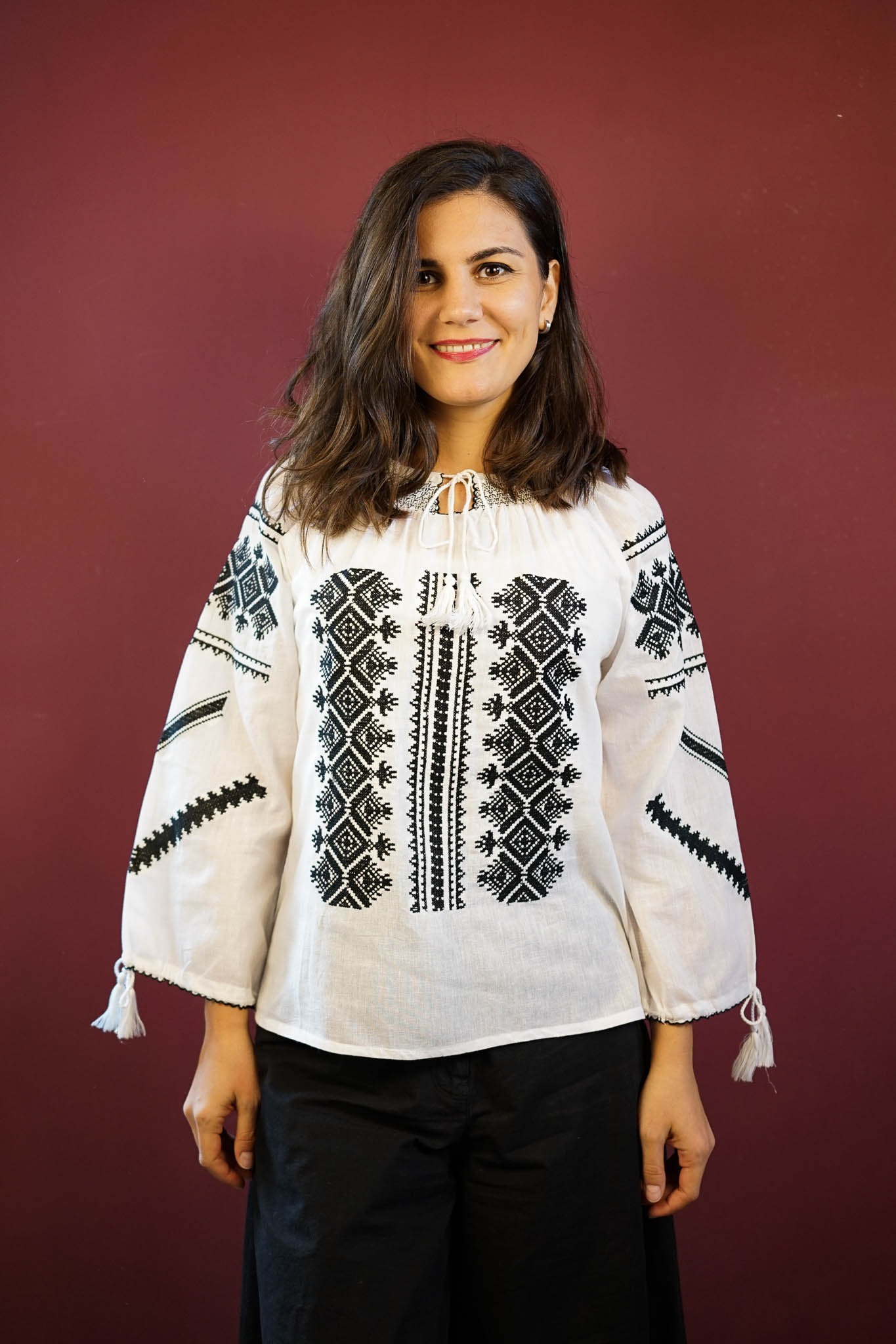 Ie albă deosebită, confecționată din material fin și aerat, decorată cu broderie sofisticată în nuanțe de negru, crem sau roșu. Motivele geometrice tradiționale adaugă un aer modern și rafinat, evidențiind eleganța simplității. Perfectă pentru orice ocazie, această ie îmbină tradiția cu stilul contemporan, oferind o piesă versatilă și ușor de integrat în garderoba ta. Broderia contrastantă pune în valoare frumusețea designului, creând un echilibru armonios între clasic și modern.