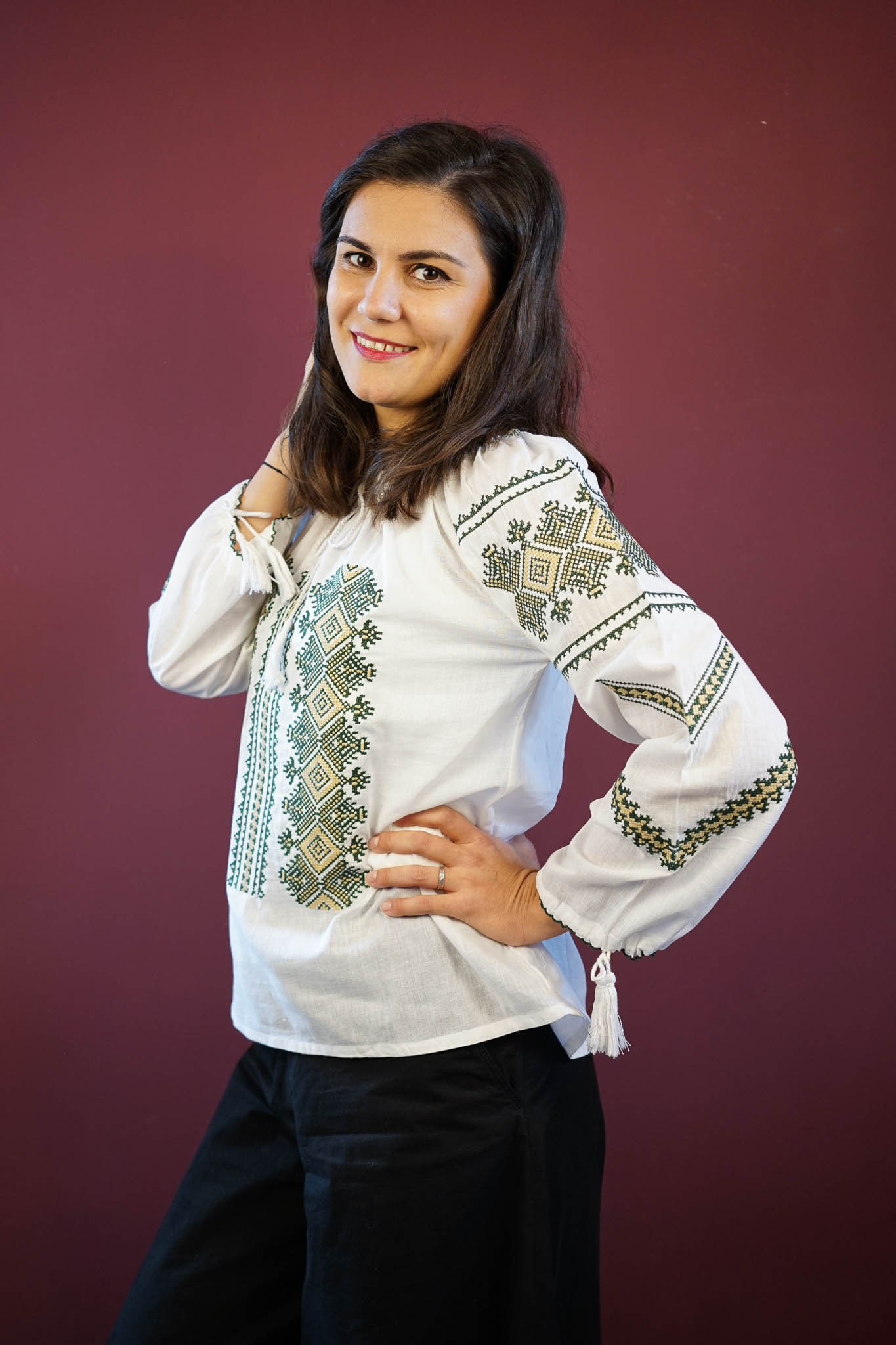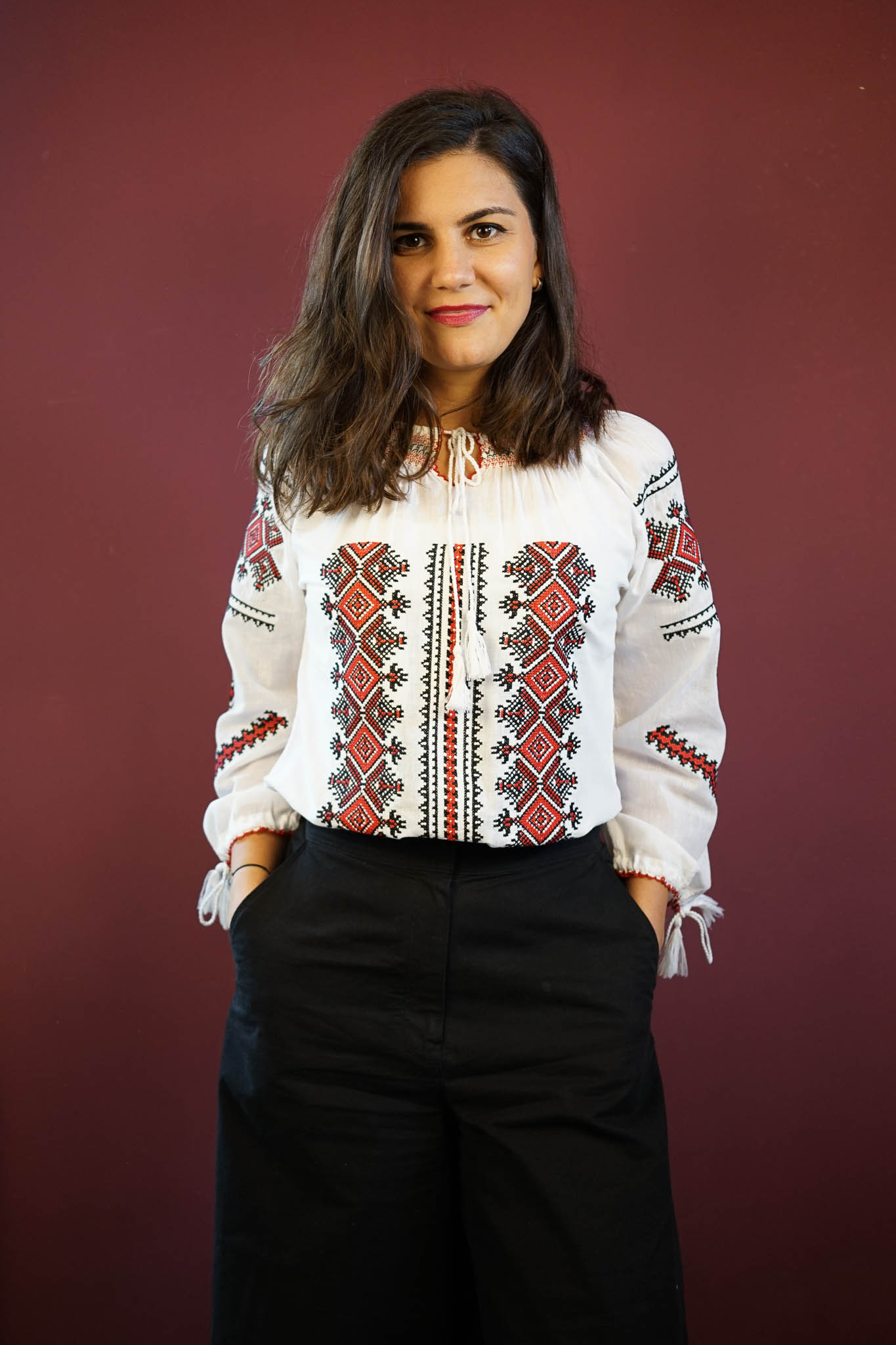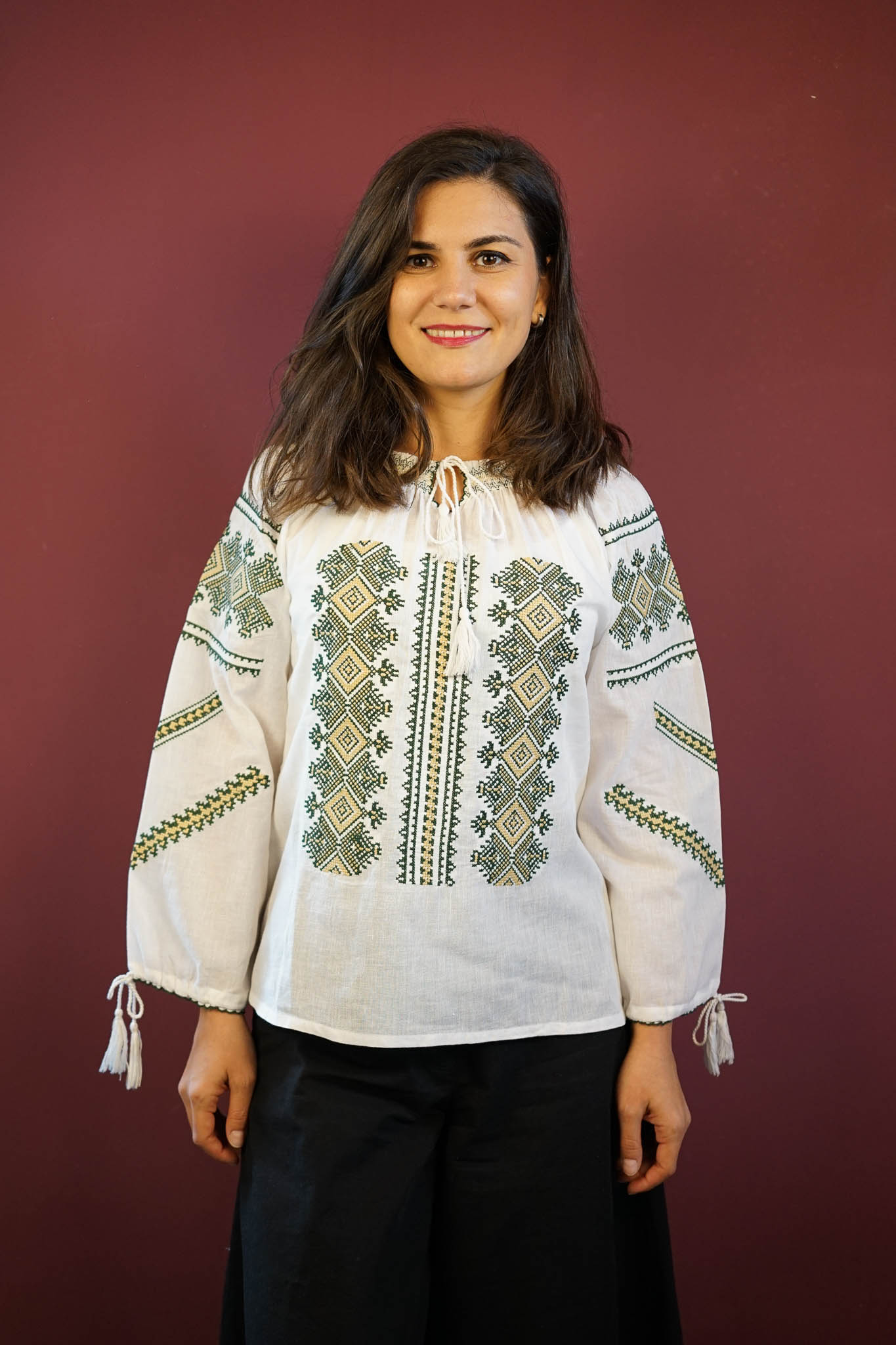 Ie albă deosebită, confecționată din material fin și aerat, decorată cu broderie sofisticată în nuanțe de negru, crem sau roșu. Motivele geometrice tradiționale adaugă un aer modern și rafinat, evidențiind eleganța simplității. Perfectă pentru orice ocazie, această ie îmbină tradiția cu stilul contemporan, oferind o piesă versatilă și ușor de integrat în garderoba ta. Broderia contrastantă pune în valoare frumusețea designului, creând un echilibru armonios între clasic și modern.