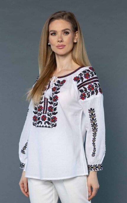 Această ie de damă albă, decorată cu broderie roșie vibrantă, aduce un farmec tradițional reinterpretat într-un stil modern. Confecționată din materiale ușoare și confortabile, oferă o senzație plăcută la purtare, fiind perfectă pentru orice ocazie. Broderia roșie, plină de viață, scoate în evidență motivele tradiționale, adăugând un contrast puternic și elegant. Această ie este alegerea ideală pentru femeile care vor să îmbine tradiția cu un look contemporan, atrăgător și autentic.