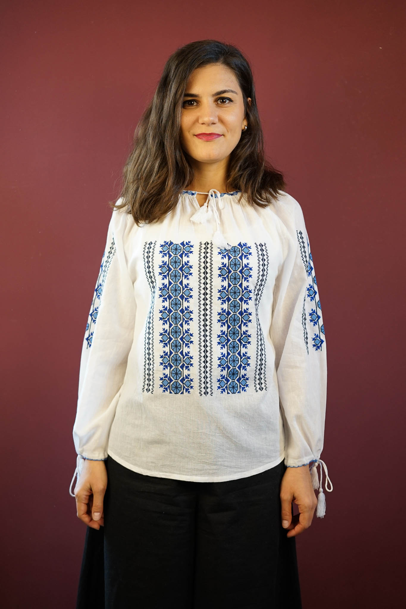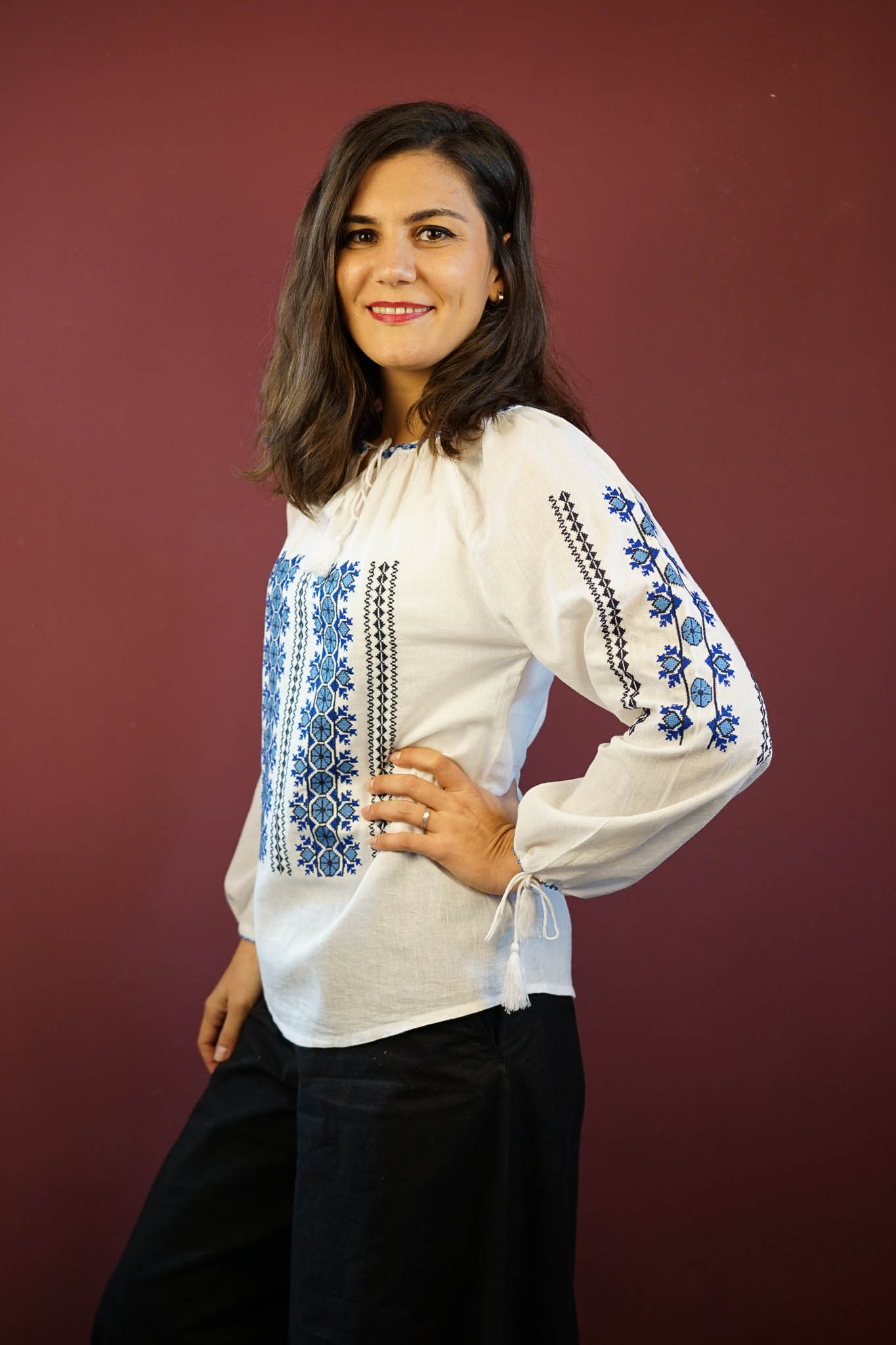 O piesă sofisticată ce îmbină tradiția cu eleganța modernă. Confectionată din materiale fine, această ie se evidențiază prin broderia albastră rafinată, care înfățișează motivul roții – simbol al echilibrului și continuității. Perfectă pentru evenimente speciale sau momentele în care vrei să strălucești cu un look autentic, această ie aduce un strop de culoare și distincție în orice ținută. Un design care captează privirile și transmite frumusețea tradițiilor românești într-o manieră modernă și feminină!