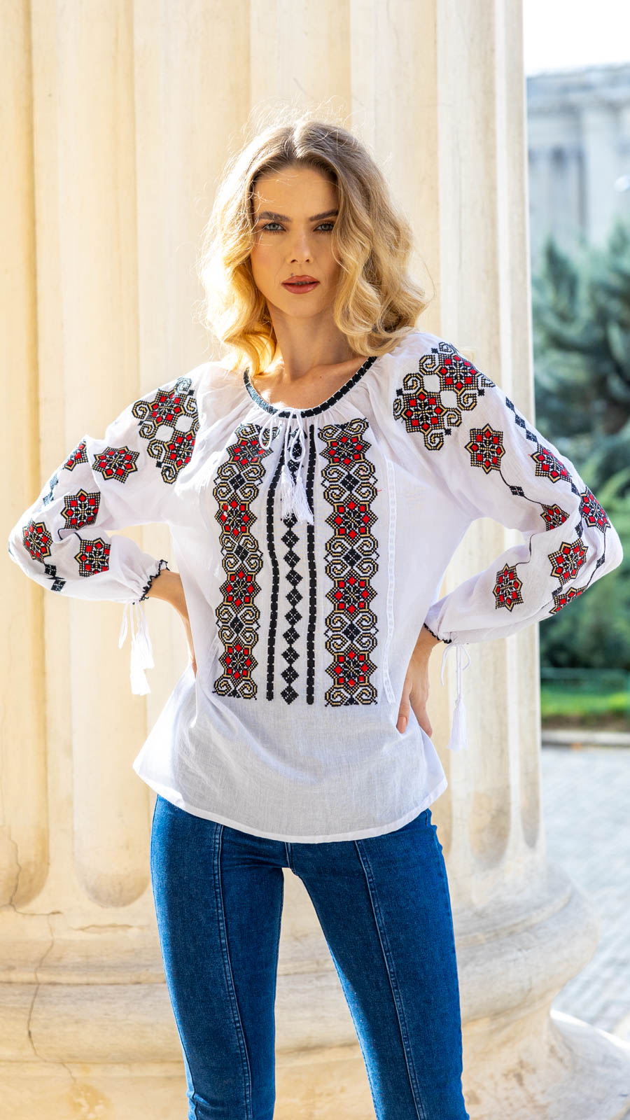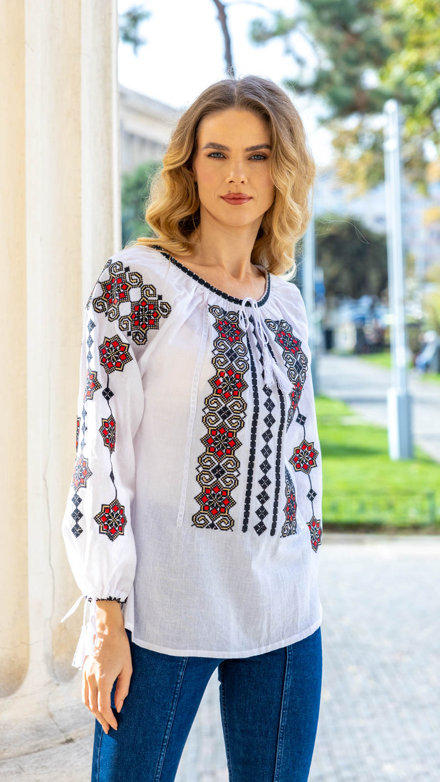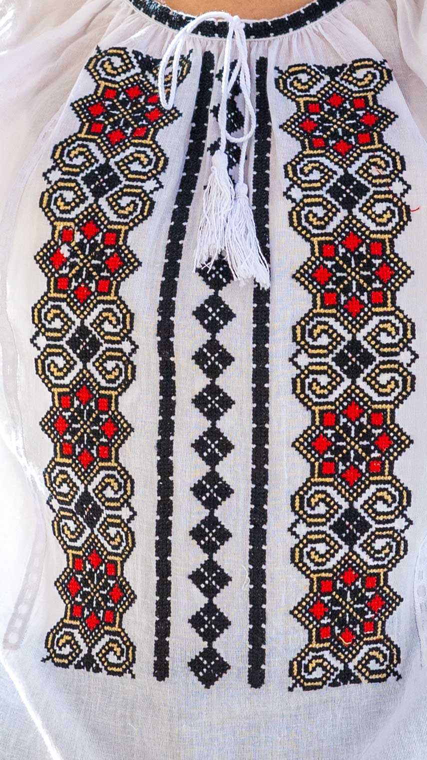 Ie cu motive tradiţionale, brodată la maşină.