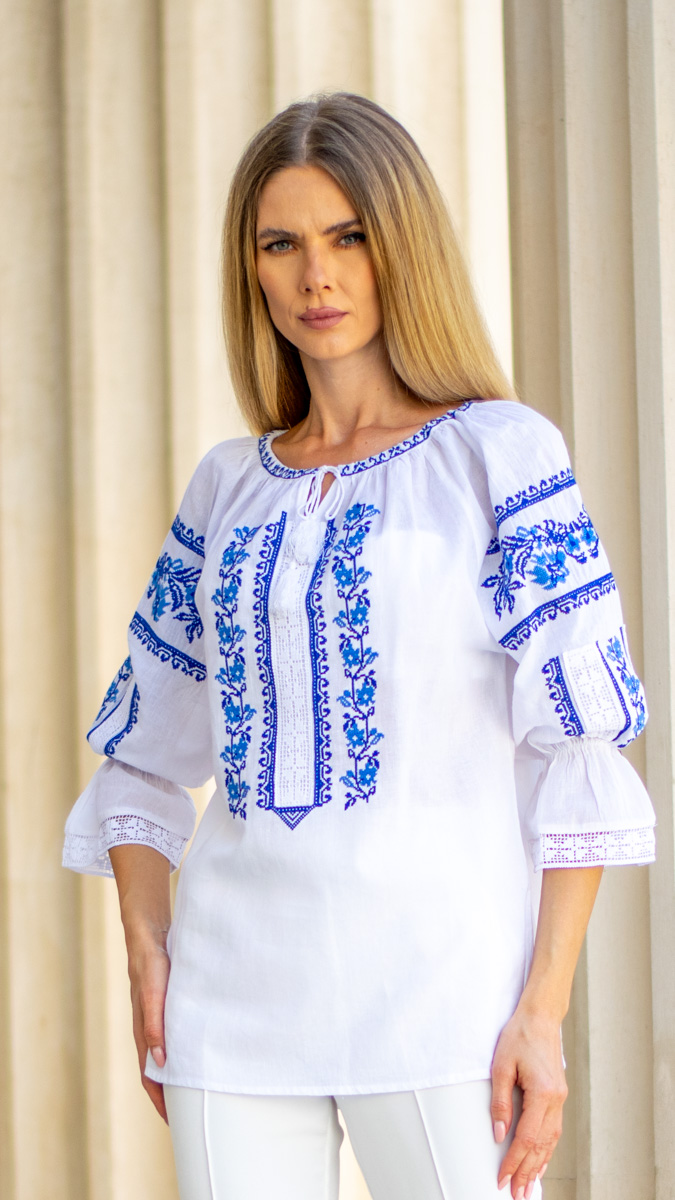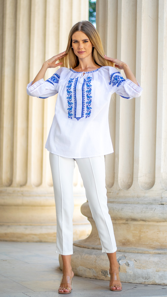 Această ie de damă albă, decorată cu broderie florală albastră, aduce un echilibru perfect între tradiție și modernitate. Realizată din materiale confortabile și ușor de purtat, este ideală pentru femeile care doresc să adauge un strop de autenticitate și rafinament în garderoba lor.