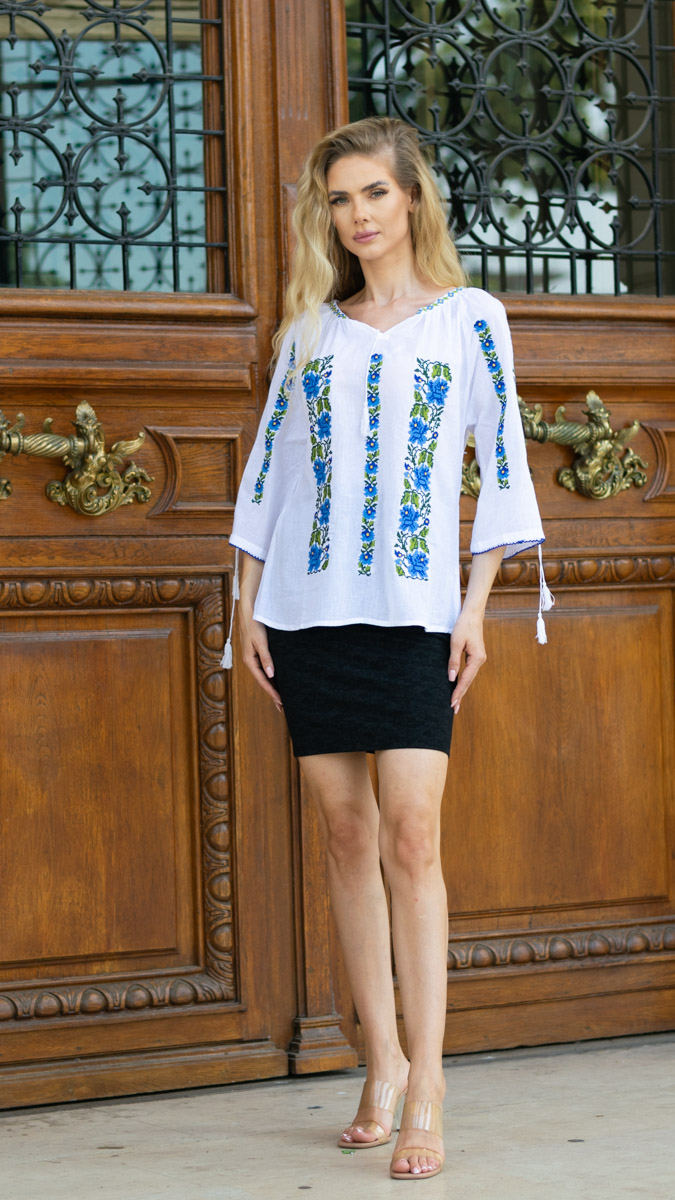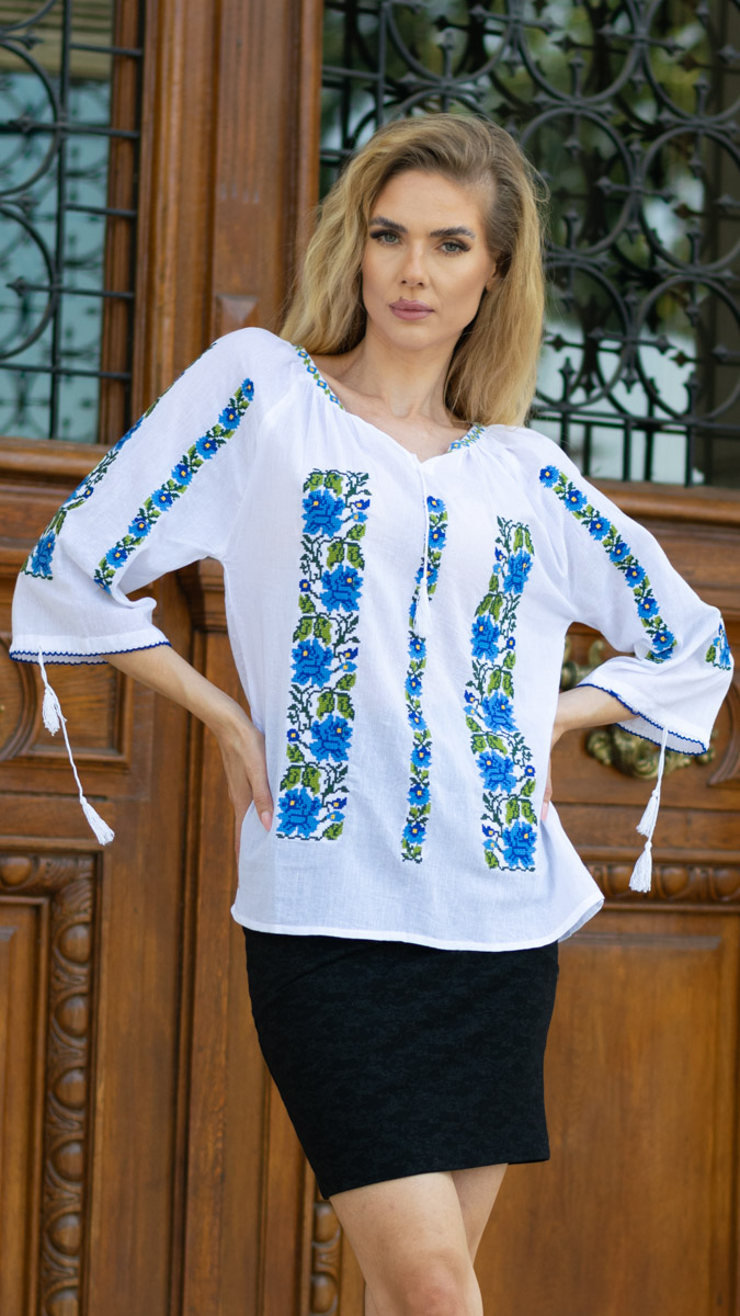 Această ie de damă, de un alb imaculat, cucerește privirile prin broderia sa florală albastră, plină de eleganță și rafinament. Fiecare detaliu este lucrat pentru a aduce la viață motivele tradiționale, într-o armonie perfectă între stil clasic și modern. Ideală pentru a adăuga un strop de prospețime și delicatețe oricărei ținute, această ie este alegerea perfectă pentru femeile care vor să îmbine frumusețea tradiției cu un aer contemporan și sofisticat!