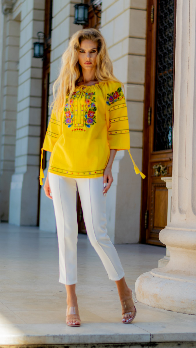 Radiază eleganță cu această ie galbenă pentru dame, decorată cu broderii florale multicolore vibrante. Cusăturile delicate îmbină tradiția cu stilul modern, oferind o piesă unică, plină de personalitate. Ideală pentru evenimente speciale sau pentru a adăuga un strop de culoare garderobei tale zilnice, această ie îți va scoate în evidență frumusețea naturală și dragostea pentru tradiții autentice.