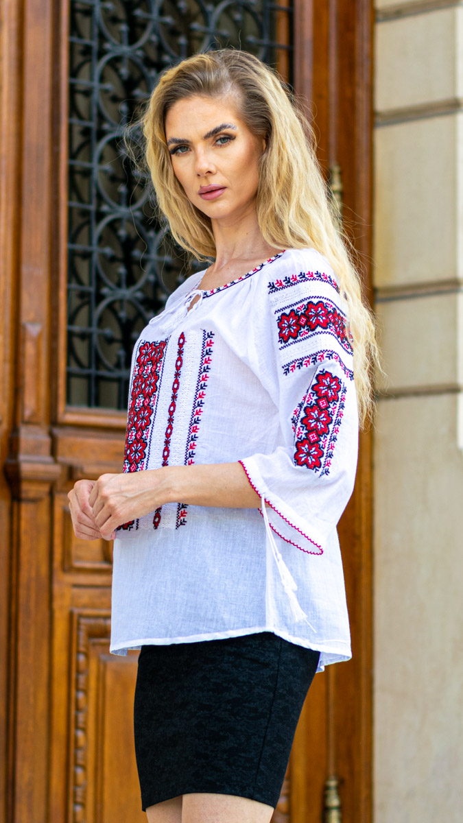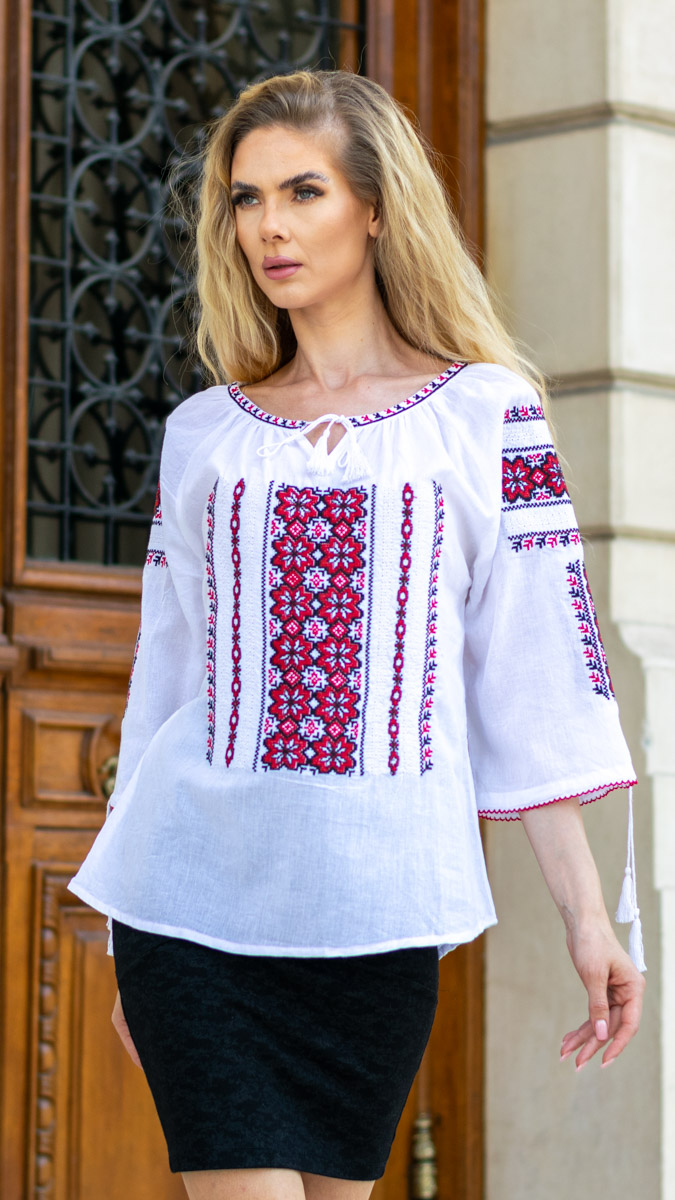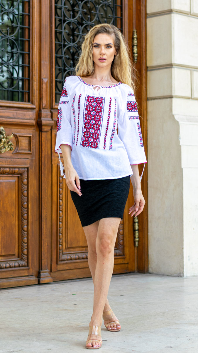 Această ie de damă albă, cu broderie roșie vibrantă, este o alegere plină de farmec și tradiție. Realizată dintr-un material lejer, broderia roșie detaliată creează un contrast puternic și captivant, aducând un plus de eleganță și personalitate ținutei tale. Perfectă pentru a evidenția stilul autentic și pasional, această ie este ideală atât pentru ținutele casual, cât și pentru ocazii speciale, oferindu-ți un look remarcabil.