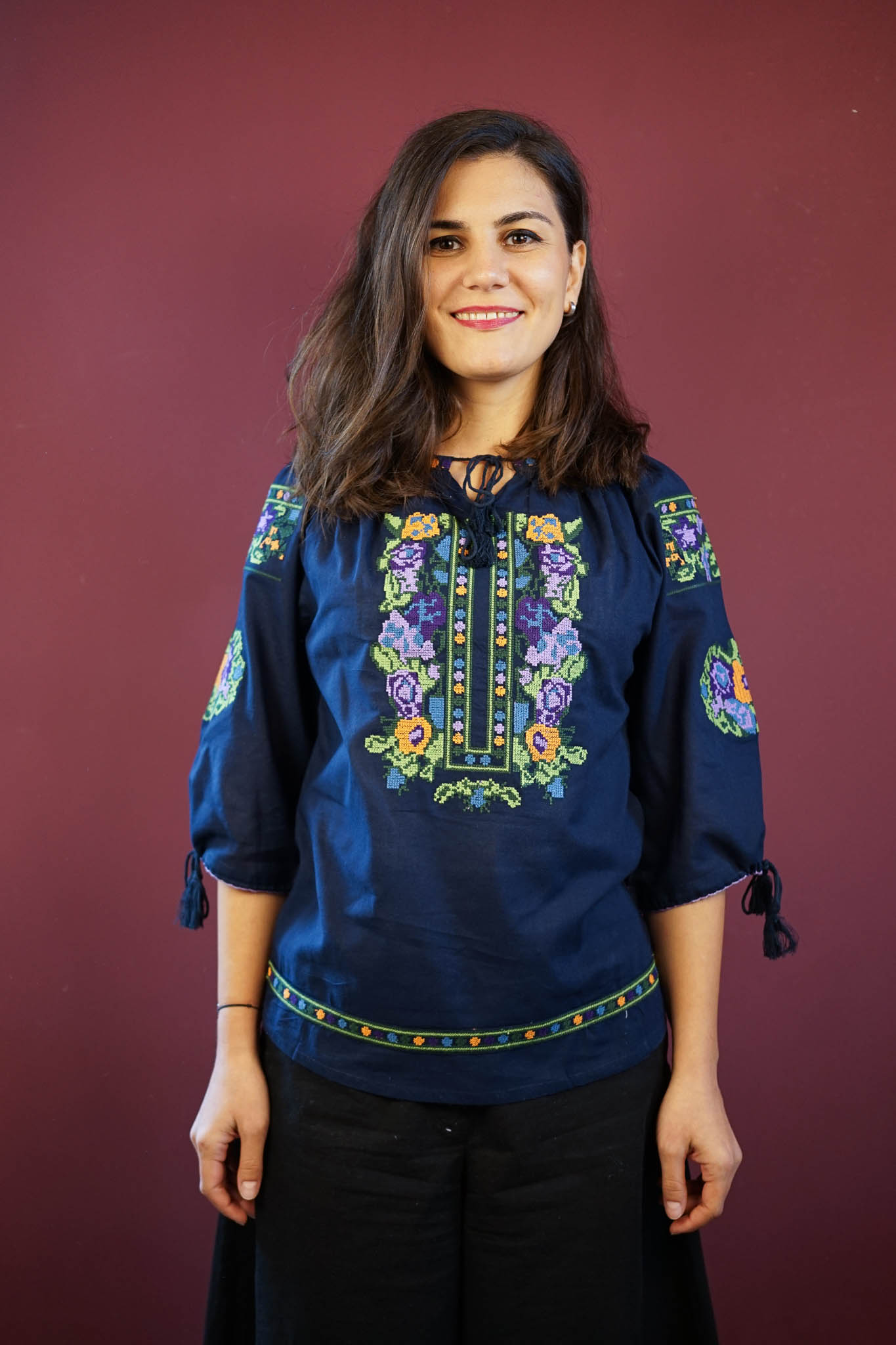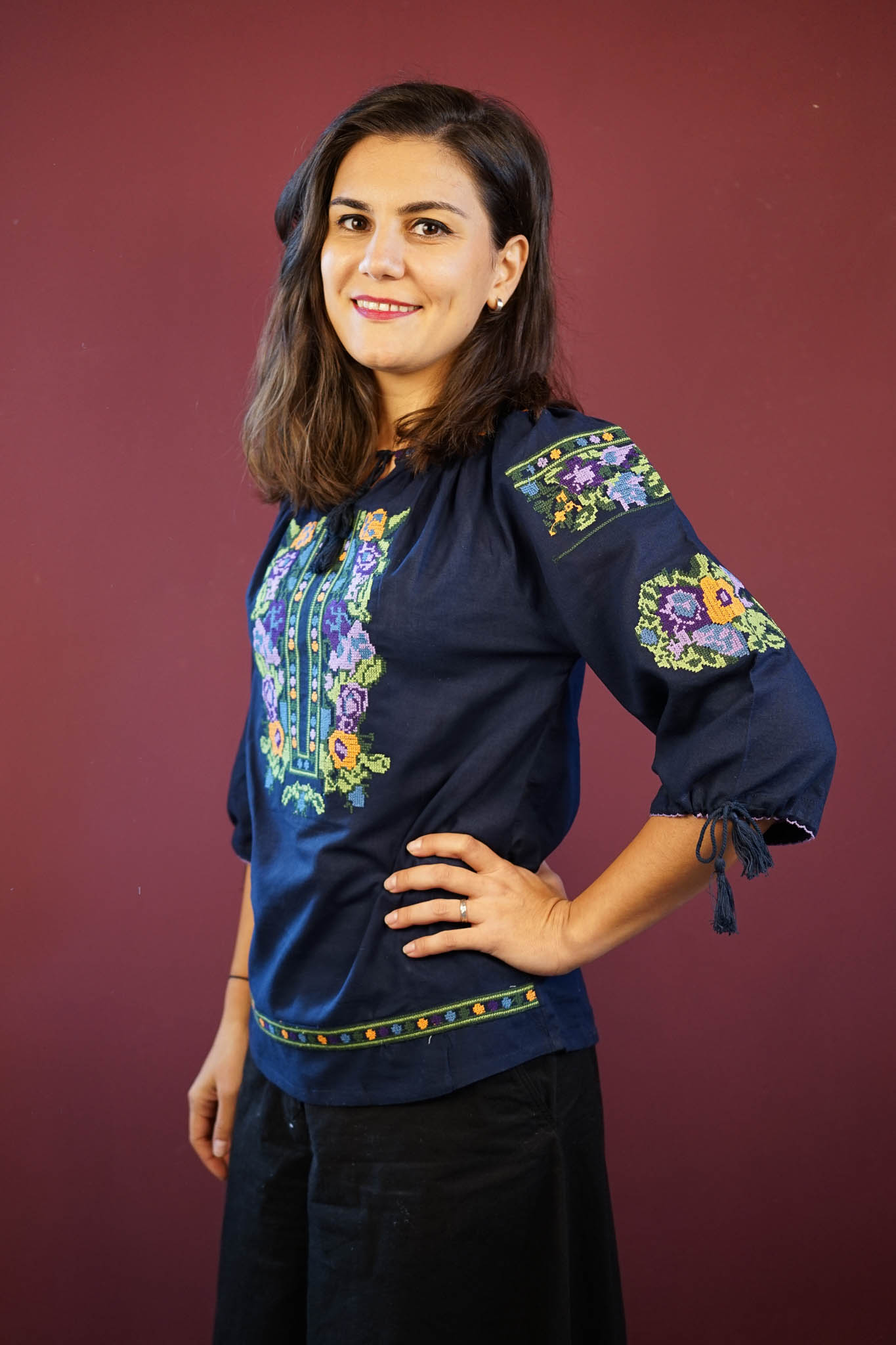 Ie bleumarin elegantă, realizată din material ușor și confortabil, decorată cu o broderie multicoloră vibrantă, inspirată de motive florale tradiționale. Fiecare detaliu aduce un plus de rafinament și stil autentic românesc. Designul său versatil poate fi purtat atât la evenimente speciale, cât și în ținute casual, oferind o notă de originalitate. Culoarea bleumarin, sofisticată și modernă, pune în evidență broderia colorată, făcând această ie o piesă de rezistență în garderoba oricărei femei.