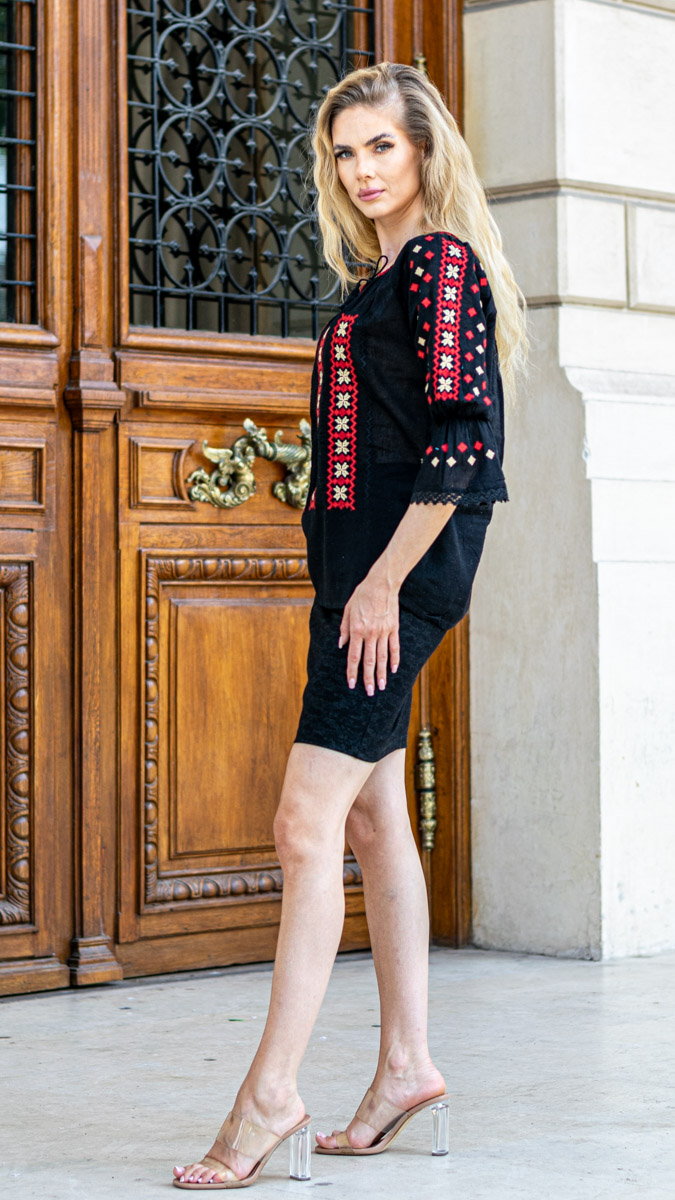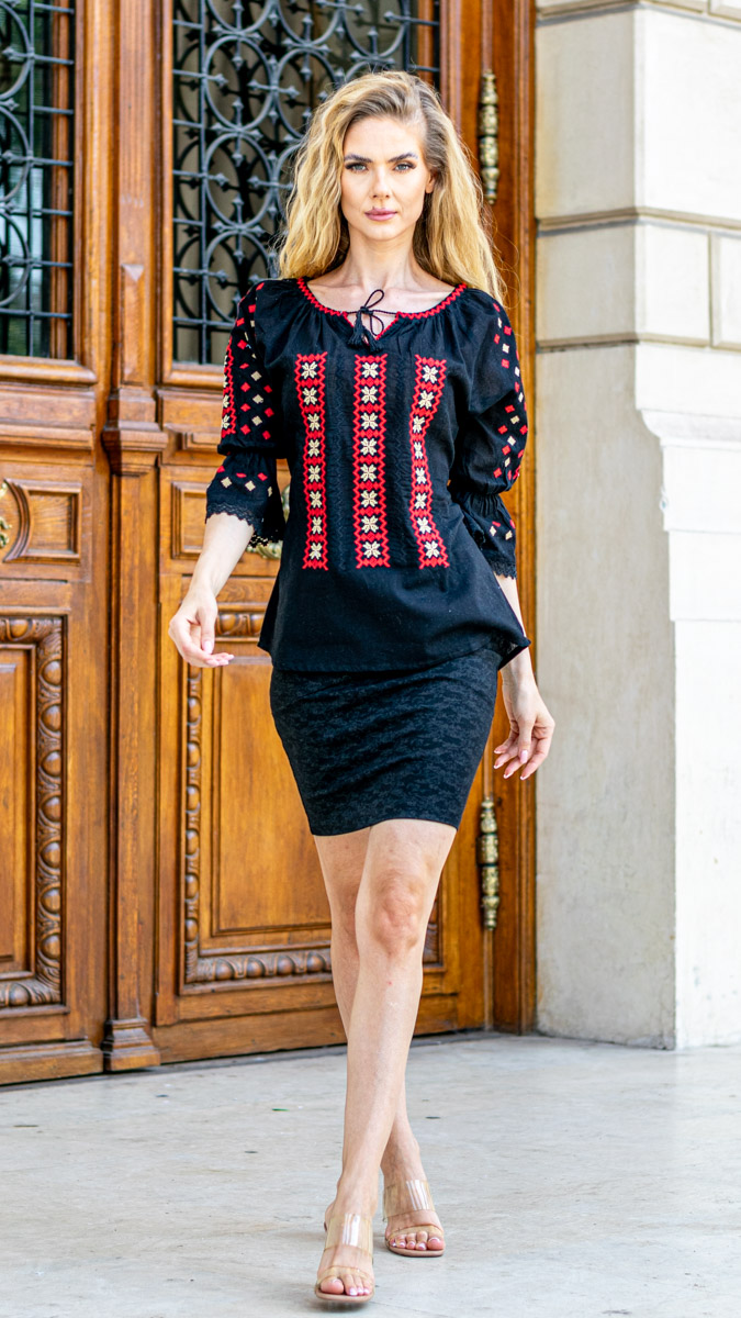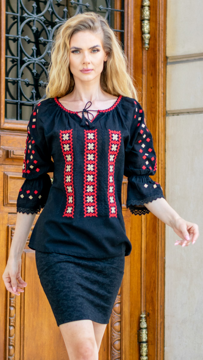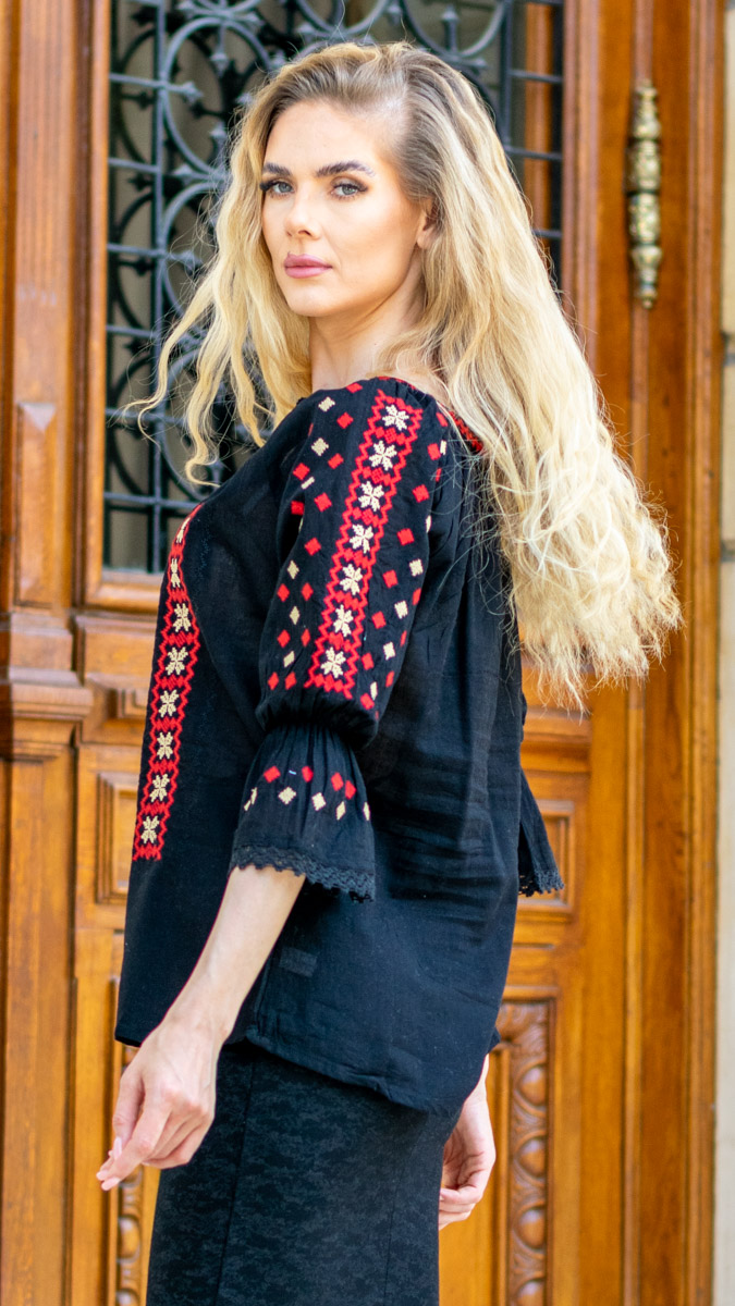 Această ie de damă neagră, cu broderie roșie intensă, emană un farmec aparte, îmbinând tradiția cu o eleganță modernă. Contrastul puternic dintre negrul profund și broderia roșie atrăgătoare creează un look sofisticat și plin de personalitate. Realizată din materiale de calitate, această ie oferă atât confort, cât și stil, fiind perfectă pentru evenimente speciale sau ocazii casual în care vrei să ieși în evidență. Alege o piesă vestimentară care combină misterul și eleganța cu un aer autentic românesc!