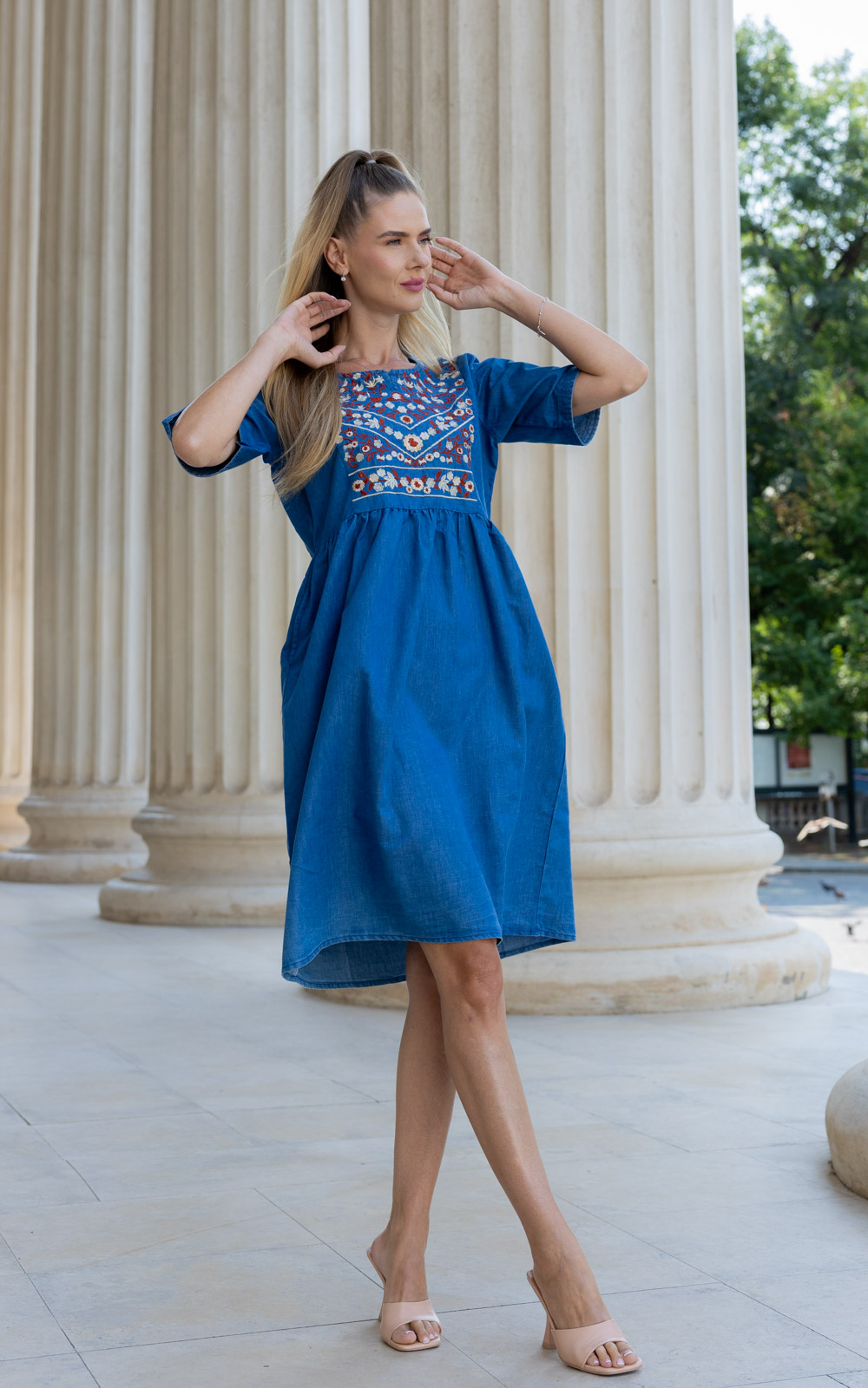 Rochie realizată din 100% bumbac tip denim, lejeră și confortabilă. Croiala este ușor evazată, cu talie ridicată și buzunare laterale practice. Mâneca scurtă adaugă libertate de mișcare, iar broderia florală multicoloră de pe piept oferă un plus de feminitate și rafinament. O piesă modernă cu accente etno, ideală pentru ținute de zi sau plimbări de vară.