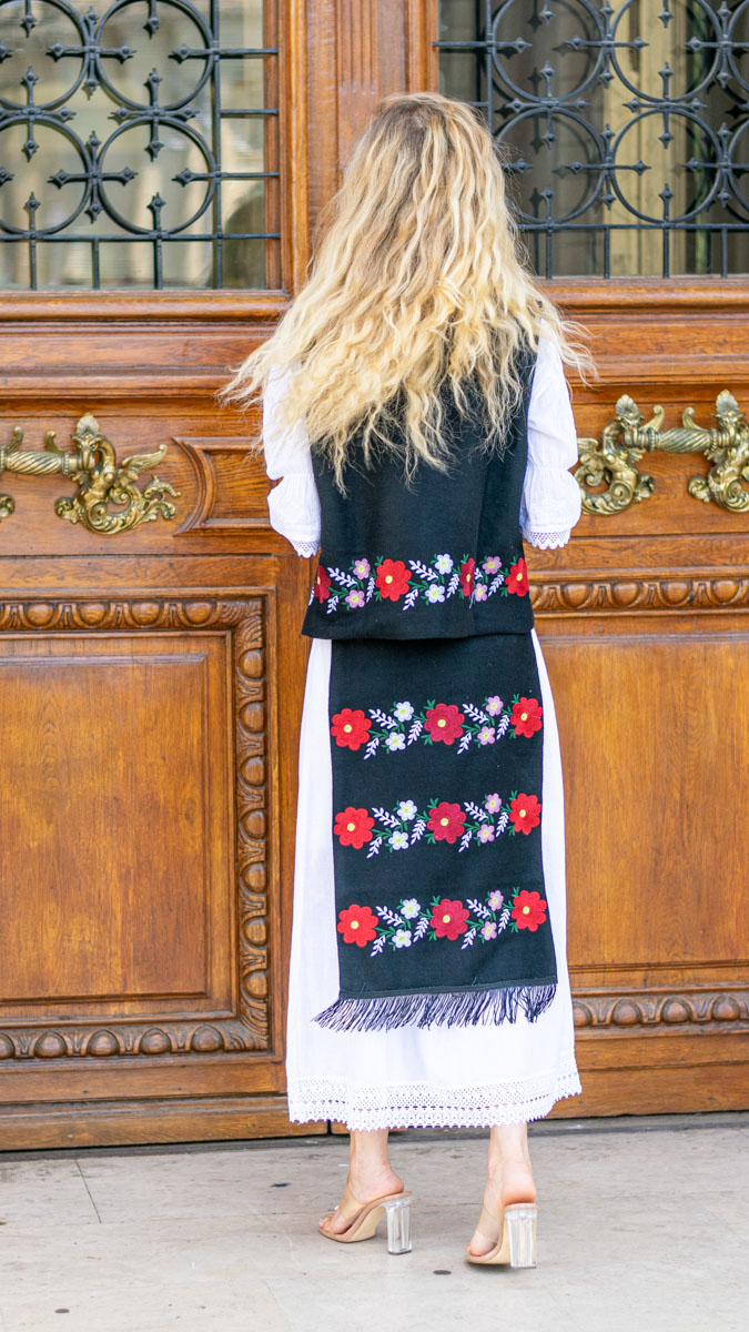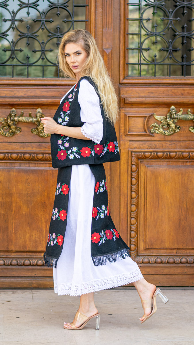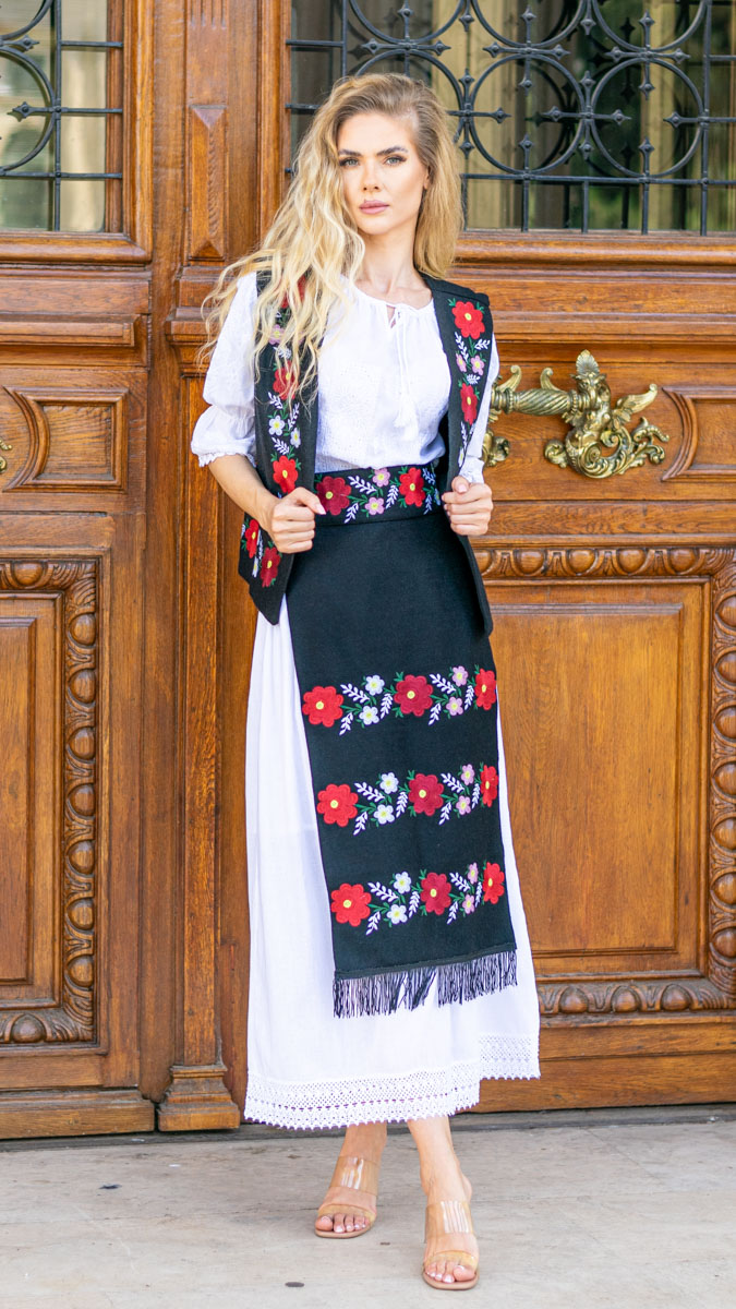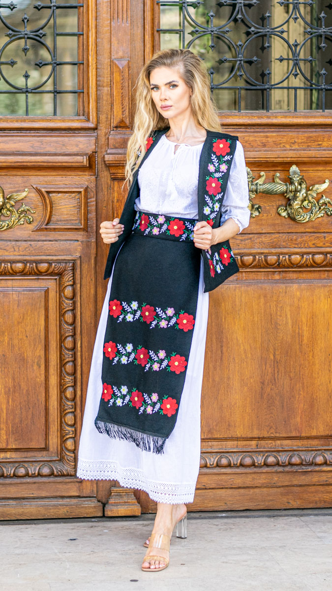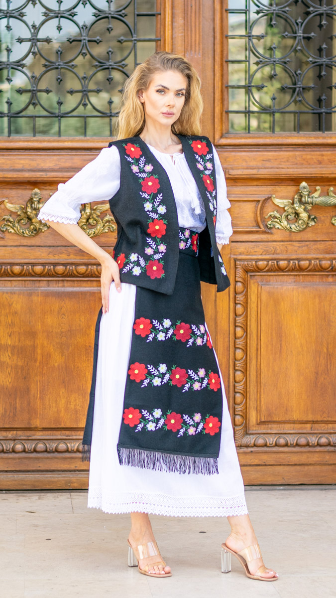 Acest set tradițional negru, cu broderie florală multicoloră, îmbină eleganța clasică cu accentele vibrante ale motivelor tradiționale. Cu detalii brodate fin și un design rafinat, setul este perfect pentru a te remarca la evenimente speciale sau ocazii deosebite. Un echilibru ideal între stilul autentic și modern!