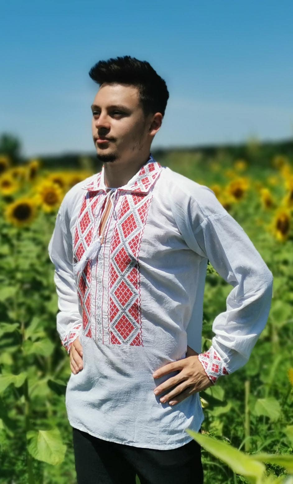 Ie pentru bărbați, de un alb imaculat, este o piesă vestimentară ce îmbină tradiția românească cu un stil contemporan rafinat. Broderia roșie în formă de romb adaugă un element distinctive, atrăgător și plin de personalitate. Aceasta nu doar că evidențiază măiestria, dar aduce și un zâmbet de căldură și energie, prin nuanțele intense ale roșului.