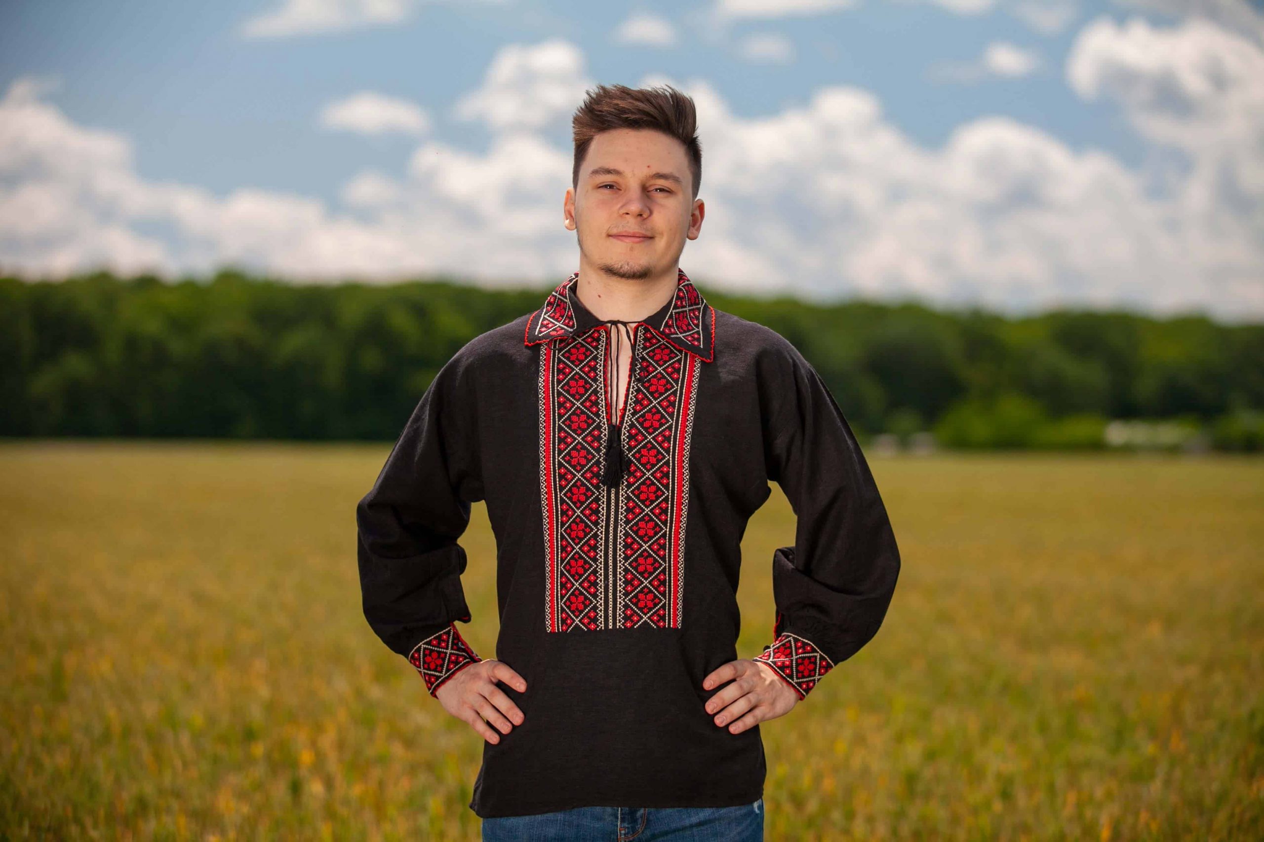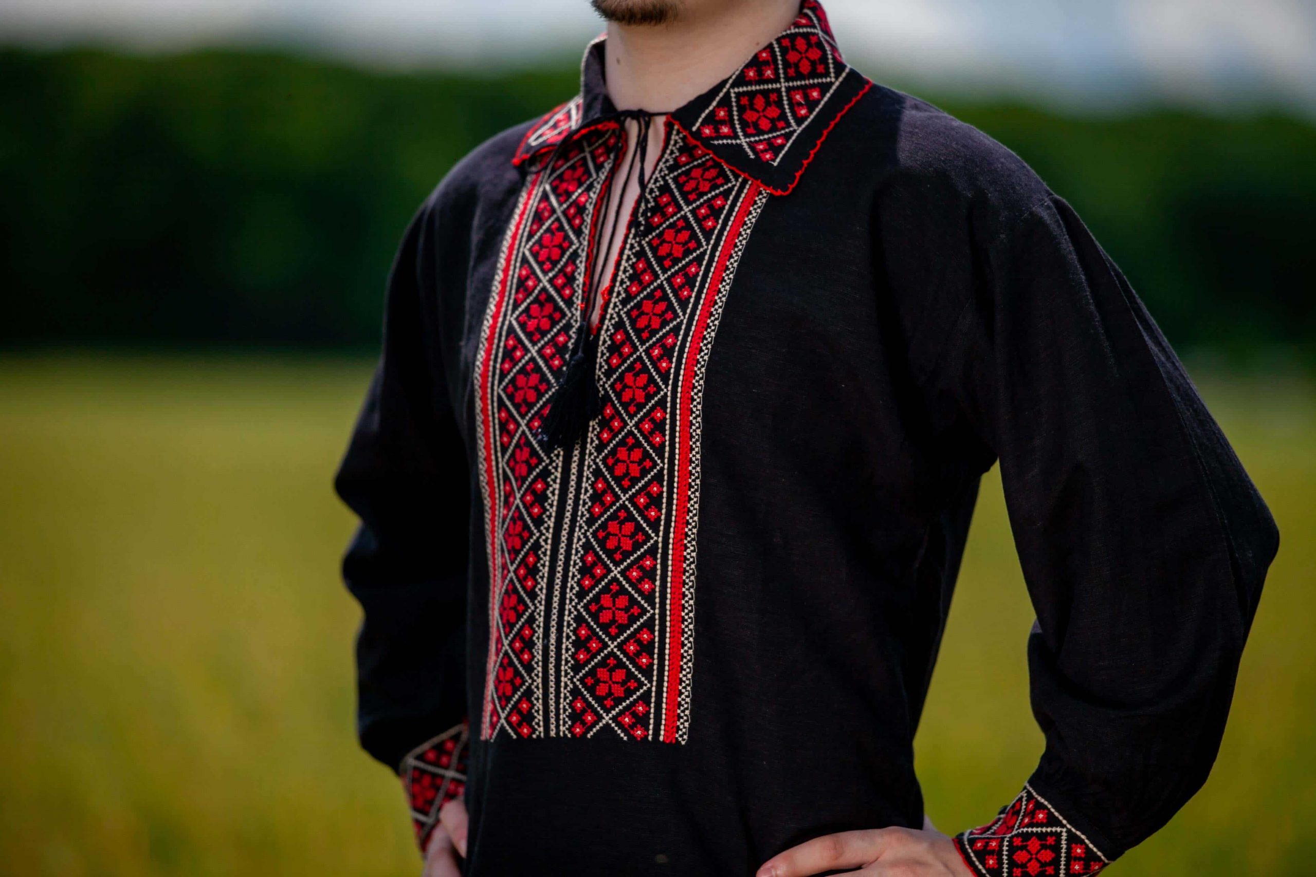 Această ie de bărbați, în nuanțe elegante de negru, îmbogățită cu broderie roșie vibrantă și motive geometrice tradiționale, este o piesă vestimentară care emană rafinament și putere. Contrastul puternic între fondul întunecat și detaliile brodate în roșu atrage privirile, conferind iei un aspect sofisticat și impunător, ideal pentru bărbatul modern care apreciază atât tradiția, cât și stilul contemporan.