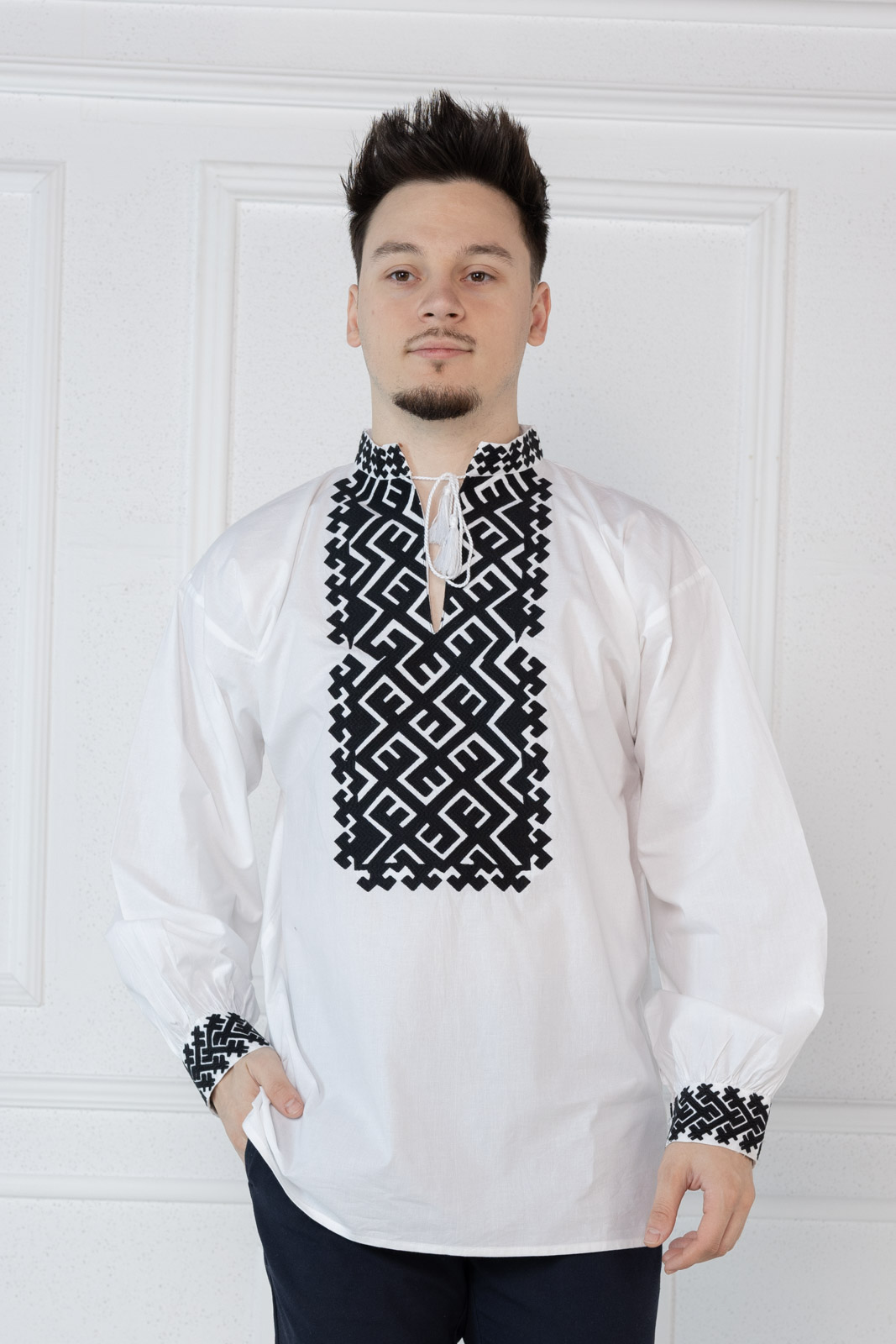 Cămașa tradițională bărbătească „Zorile Negre” este o piesă cu personalitate puternică, inspirată din portul specific zonei Munteniei. Broderia geometrică neagră, densă și riguroasă, este aplicată frontal și pe manșete, evocând echilibrul, protecția și claritatea drumului interior. O cămașă care nu doar se poartă – se afirmă.